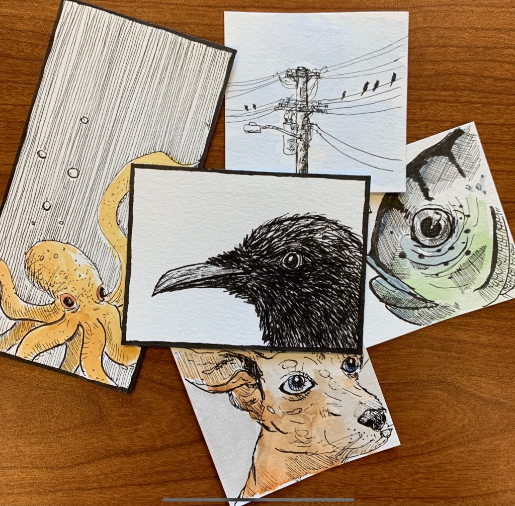 That was today. The product of all that energy? I think you can label it “studio mayhem”. Or perhaps “Art chaos” or perhaps “unplanned creativity”. Or, maybe just a big old mess. Regardless, I managed to make dozens of pieces of art, and I’ll soon get them labelled and they can start their journey around the world. Keep your eye out, you might just find one.