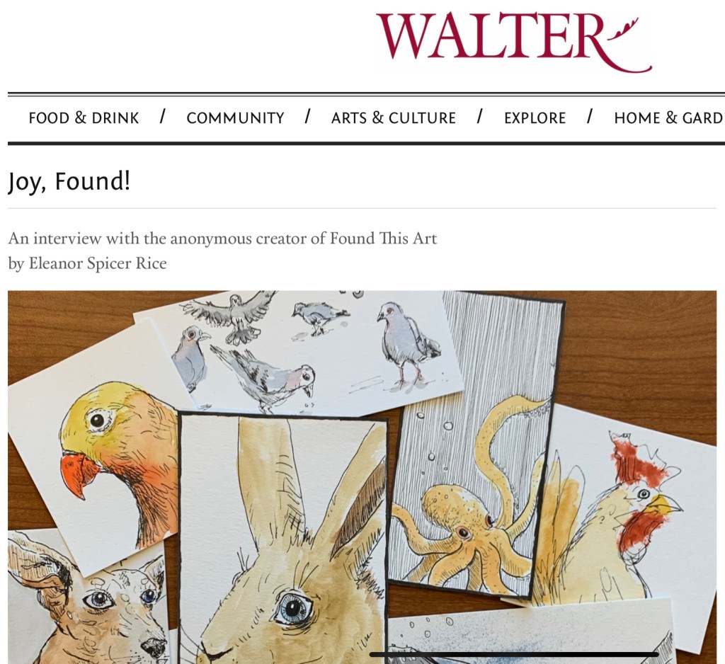 I hope you are well! Please take care of yourself and the ones you love. Let’s let compassion and kindness prevail, and I tend to think this is helped with art and creativity. Maybe you’ll pick up a pen and sketchbook? Send me some examples of YOUR art! (You can reach me by emailing FoundThisArt@gmail.com.