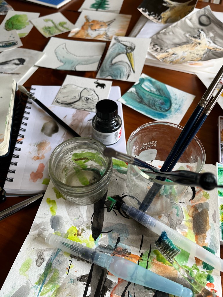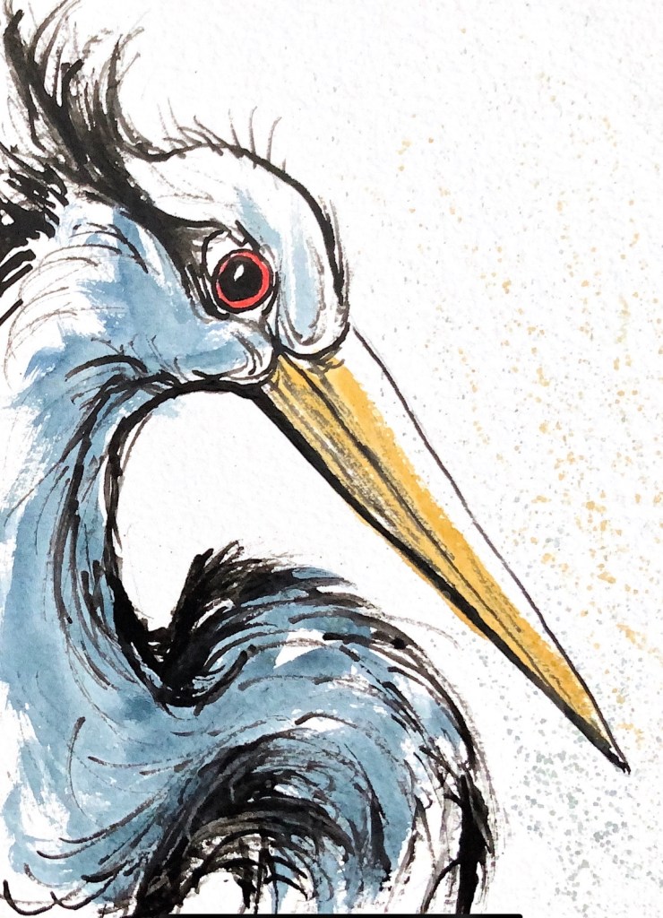 While snow blankets my yard outside, the paint brushes have been busy in the studio! It’s been a month of creativity – in addition to this project, I am working on some other fun things – they too involve pen and ink with splashes of colour. I’ve been still on an ‘animal’ theme of late, such as this Heron (magnificent birds!!)